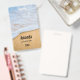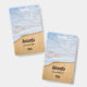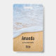 Name tag with a photograph of a golden brown sandy beach with white foamy surf.