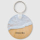 A keychain with a photograph of a golden brown sandy beach with white foamy surf.