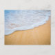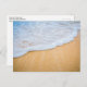 A postcard with a photograph of a golden brown sandy beach with white foamy surf.