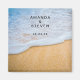 Wedding save the date magnet with a photograph of a golden brown sandy beach with white foamy surf.