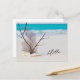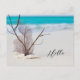 A postcard with a gorgeous photograph. Tropical blue water and foamy surf in the background. A collection of seashells and stems set on a white sandy beach.