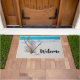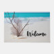 A welcome doormat with a gorgeous photograph. Tropical blue water and foamy surf in the background. A collection of seashells and stems set on a white sandy beach.