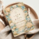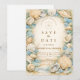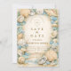 A refined coastal wedding design featuring an elegant oval wreath of seashells, oyster shells, starfish, and soft sea glass accents. Neutral sandy tones blend with muted ocean blues and delicate dune grasses to create a serene seaside aesthetic. The warm parchment background enhances the natural textures while maintaining a timeless, elevated feel. Perfect for a romantic beach celebration with classic coastal charm.
