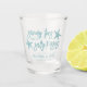Beachy shot glasses make great favours for your destination wedding! Design features "sandy toes and salty kisses" in soft teal lettering with two starfish. Personalise with your names and wedding date beneath.
