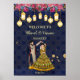 Sangeet welcome custom sign dancing Indian couple with Moroccan lanterns, burgundy flowers on the dark blue background. Can be used for reception as well.