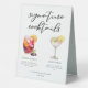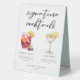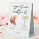 This chic signature cocktails table tent sign features simple black typography above 2 drinks and their ingredients for your wedding bar. A cute summer Sangria and lemon drop martini drawing add a cool flair to your bar menu. Complete with the couple's names and date for their reception.