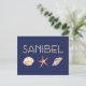 Sanibel Island, Florida seashells design with watercolor starfish and shells and the name Sanibel in a deco font. Blue background can be changed to another colour if you like.