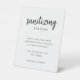 Simple, stylish wedding hand sanitising station pedestal sign in a modern minimalist design style with an elegant natural script typography in classic black and white, with an informal handwriting style font. The text can easily be personalised for a unique one of a kind design to keep guests safe during your special day.