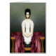 A creepy girl with short dark hair, large, buggy eyes and no mouth, her arms appearing as her straitjacket. Sitting in a green room at a sanitorium, a red satin blanket is draped around her legless torso. Original digital art by Taylor Addams.
