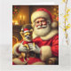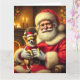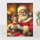 An adorable Christmas scene with Santa Claus and a cute Chihuahua puppy wearing a Santa hat sitting by a warm cosy fire. It includes an original silly Christmas message that dog lovers are sure to love.