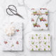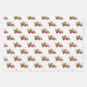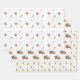 Three sheets of Christmas wrapping paper. Santa on the trail, Santa with a vintage truck, and Christmas trees. All have a white background.
