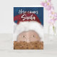 This fun watercolor Santa is eye level with a plate of chocolate chip cookies, looking very interested! This humorous holiday card announcing Santa is coming soon and wishing lots of joy and cookies is perfect for any recipient.