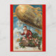 Vintage Christmas design with Santa Claus delivering toys in a golden blimp instead of his traditional sleigh.