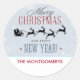 Personalised festive Christmas stickers. A subtle grey background with snowflakes. Fancy trendy lettering which says: Merry Christmas and Happy New Year. With a black silhouette Santa riding in his sleigh being pulled by his reindeer flying across the sky.