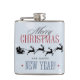 A festive Christmas flask. A subtle grey background with snowflakes. Fancy trendy lettering which says: Merry Christmas and Happy New Year. With a black silhouette Santa riding in his sleigh being pulled by his reindeer flying across the sky.