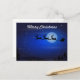 Merry Christmas greeting. A festive christmas illustration of santa in his sleigh and his reindeer flying across the dark blue night sky. A glowing moon illuminates the sky and one can see twinkling stars all around. Trees and mountains can be seen on the earth below.