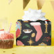 This design is a festive wrapping paper that celebrates the magic of Christmas traditions. Illustrated in a playful, painterly style, it features portraits of Santa Claus and Mrs. Claus in gilded frames, cosy holiday sweaters, stockings, candy canes, hot cocoa, candles, and evergreen sprigs—all set against a striking black background that makes the colours pop.