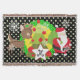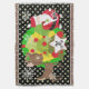 Santa and Reindeer Christmas holiday throw blanket, colourful, fun, cute, and cheery! Features Santa Clause dressed in his red suit and stocking cap with a bag of toys flung on his back, a Christmas tree with red balls, cute brown reindeer, snowflakes, and white polka dots on a background of black, green, and yellow. There's also a star shape banner you can personalise with your monogram initial!