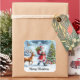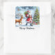 Santa Claus strolls through a snowy landscape, accompanied by a friendly reindeer. He carries a basket filled with festive greenery, while colourful gifts are stacked near a twinkling Christmas tree.