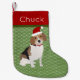 Deck the halls with this adorable personalised dog stocking. A lighthearted design for anyone who loves beagles. A cute cartoon art of a beagle wearing a Santa hat with a green polka dot background. Original vector art by Night Owl's Menagerie, 2016.