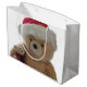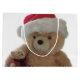 A big, chubby bear with a Santa hat and a small bear in a red sweater with muffler on its lap