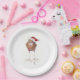 9" white paper plate featuring bird in Santa hat