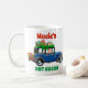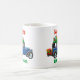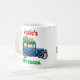 Cute personalised Christmas mug with a picture of Santa Claus in an old blue car, delivering Christmas presents. Text says, "personalised name" and "hot cocoa".