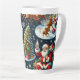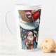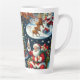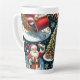This festive latte mug captures the joyful essence of Santa Claus and Christmas. The design features Santa Claus in his iconic red suit, holding a sack of gifts, with a warm, jolly smile. Surrounding him are playful details like candy canes, golden bells, and holly leaves. The background showcases a snowy village scene, complete with twinkling lights and cozy cottages, under a starry night sky.