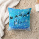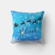 Christmas pillow with a black silhouette of santa riding in his sleigh being pulled by his reindeer flying across the sky. Believe written in a trendy script font.