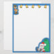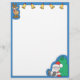This cartoon letterhead features a reindeer and five gold bells across the top, Santa Claus sitting with a big bag of toys in the bottom right corner, and a blue border.