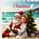 A whimsical holiday scene featuring Santa Claus and a woman in a white dress, seated on a sandy beach. Santa, with his iconic red suit and white beard, smiles warmly as he leans against a decorated Christmas tree.