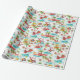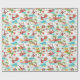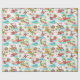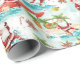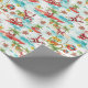 This Surfing Santa Christmas in July Coastal Wrapping Paper features jolly Santa in a Hawaiian floral shirt and red shorts, riding bright turquoise waves under swaying palm trees.