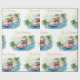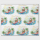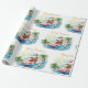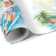 This Surfing Santa Christmas in July Coastal Wrapping Paper features jolly Santa in a Hawaiian floral shirt and red shorts, riding bright turquoise waves under swaying palm trees.