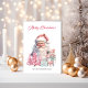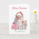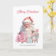 On the amazing Christmas card, a vintage Santa Claus and nutcracker stand among presents wrapped in blue paper with pink Christmas trees