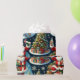 This wrapping paper features a lively and festive design with Santa Claus depicted in various joyful activities. The scenes include Santa riding his sleigh with reindeer, waving cheerfully, delivering presents to snowy houses, and enjoying milk and cookies by a Christmas tree. The repeating pattern is set against a midnight blue, starry sky, enhanced with golden accents, snowflakes, and holly sprigs. The warm reds, whites, and greens create a classic Christmas esthetic, perfect for wrapping gifts with holiday cheer.