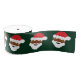 Christmas ribbon featuring Santa Claus faces with brown skin tones, wearing red and white hats on a green background.