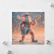 A fun, whimsical, and highly detailed photograph or 3D render featuring a stylised, fuzzy figure of Santa Claus dressed in his traditional red and white suit. Santa is wearing dark sunglasses and strikes a dramatic rock-and-roll pose while enthusiastically playing a bright light-blue and white electric guitar. The scene is set outdoors in a heavy snow flurry, with large, soft snowflakes falling around him. The background is blurred with a warm, golden-orange light emanating from the horizon.