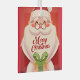 Illustration of Santa Claus holding a gift with a green bow, set against a red background, with the words "Merry Christmas" written in red cursive on his beard. The illustration is designed to resemble a square Christmas ornament, complete with a white string at the top for hanging. The style is reminiscent of vintage holiday cards, with clean lines and a limited colour palette.