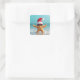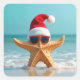 A starfish wearing a Santa hat and red sunglasses stands upright on a sandy beach in ocean surf