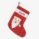 Destei's cartoon illustration of a happy Santa Claus head on a red background colour with some white dots. There is also a personalizable text area for a name on the top of the stocking.