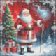 Santa Claus stands with a glowing staff beside a colourful Christmas tree, surrounded by festive presents.