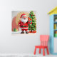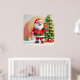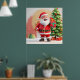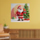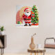 Santa Claus joyfully holding a gift and surrounded by decorated Christmas tree. The festive scene illustrates celebration, joy, and holiday spirit.