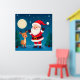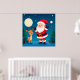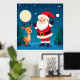 Illustration of cheerful Santa Claus with Rudolph the red-nosed reindeer under a moonlit winter sky surrounded by snowy trees.