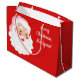 Wrap up Christmas gifts in style with this personalised gift bag. It features your own custom message along with a vintage style illustration of Santa Claus wearing a pink coloured Santa hat set against a festive red background.