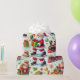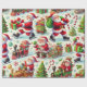 This cheerful wrapping paper design highlights Santa Claus in playful and whimsical poses. The scenes include Santa dancing with candy canes, riding a toy train filled with gifts, ice skating on a frozen pond, and decorating a glowing Christmas tree. The pattern is vibrant and colorful, using bright red, green, white, and gold shades, set against a soft snowy background. Small festive details like ornaments, snowflakes, and holly sprigs are scattered throughout, adding a touch of charm and holiday magic.
