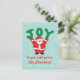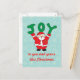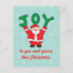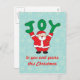This design features a fun whimsical Santa Claus holding the words Joy above him. The background is a soft winter blue with a snowflake pattern.