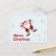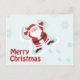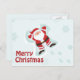 This Christmas Holiday post card has an image of Santa Clause making a snow angel with Merry Christmas written on the bottom left. In the background, there is lots of blue snowflakes.