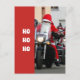 Santa Claus biker on a motorcycle in full Santa suit photo with Ho Ho Ho text to the side on red to send your Christmas greetings.