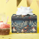 Pretty wrapping paper with an ai image of Santa Claus standing in a pine tree forest with red and white flowers.