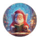 A jolly Santa sits at a desk, candlelit and surrounded by twinkling lights and Christmas trees, reading a green book. Warm, magical, and cozy, it captures holiday family joy.